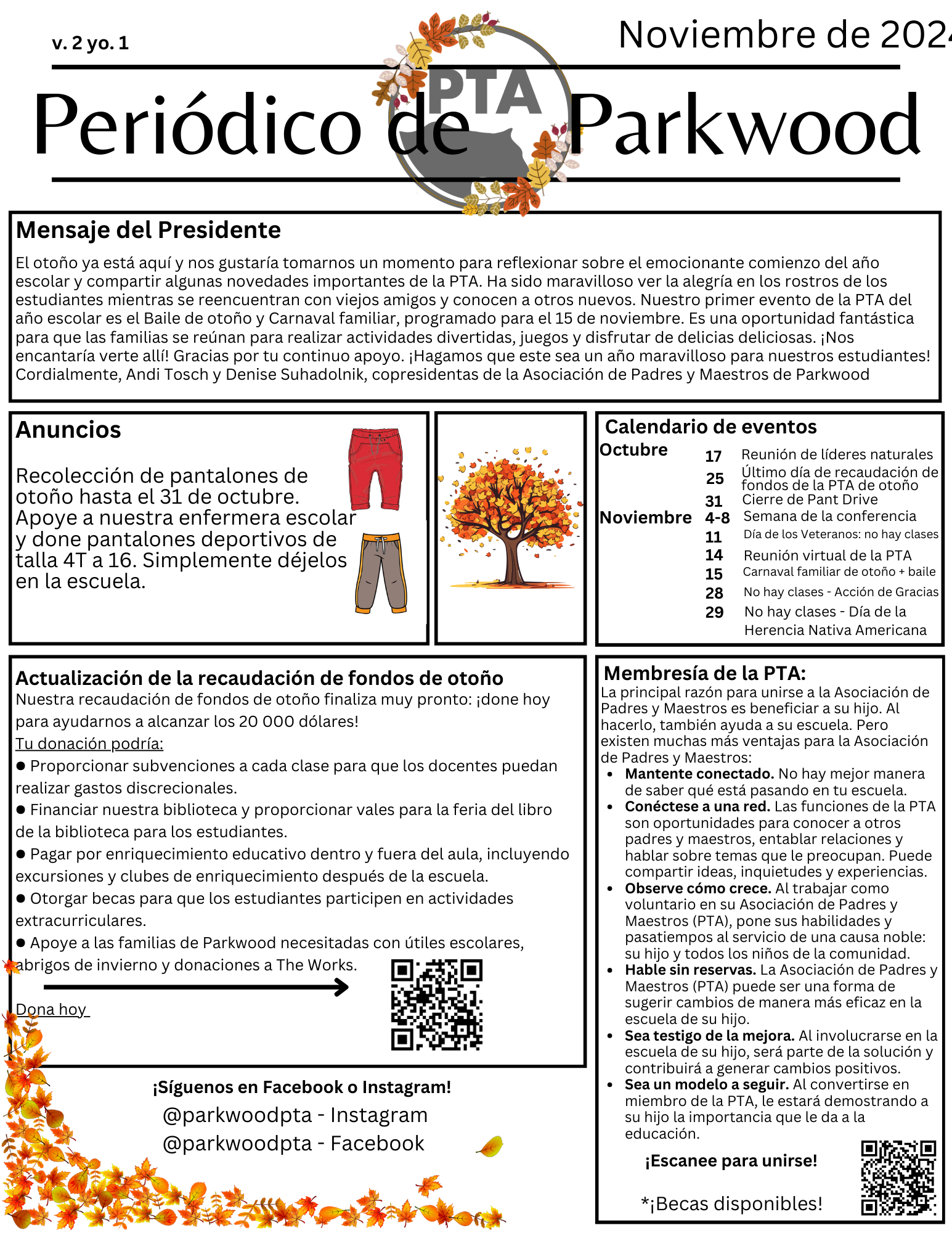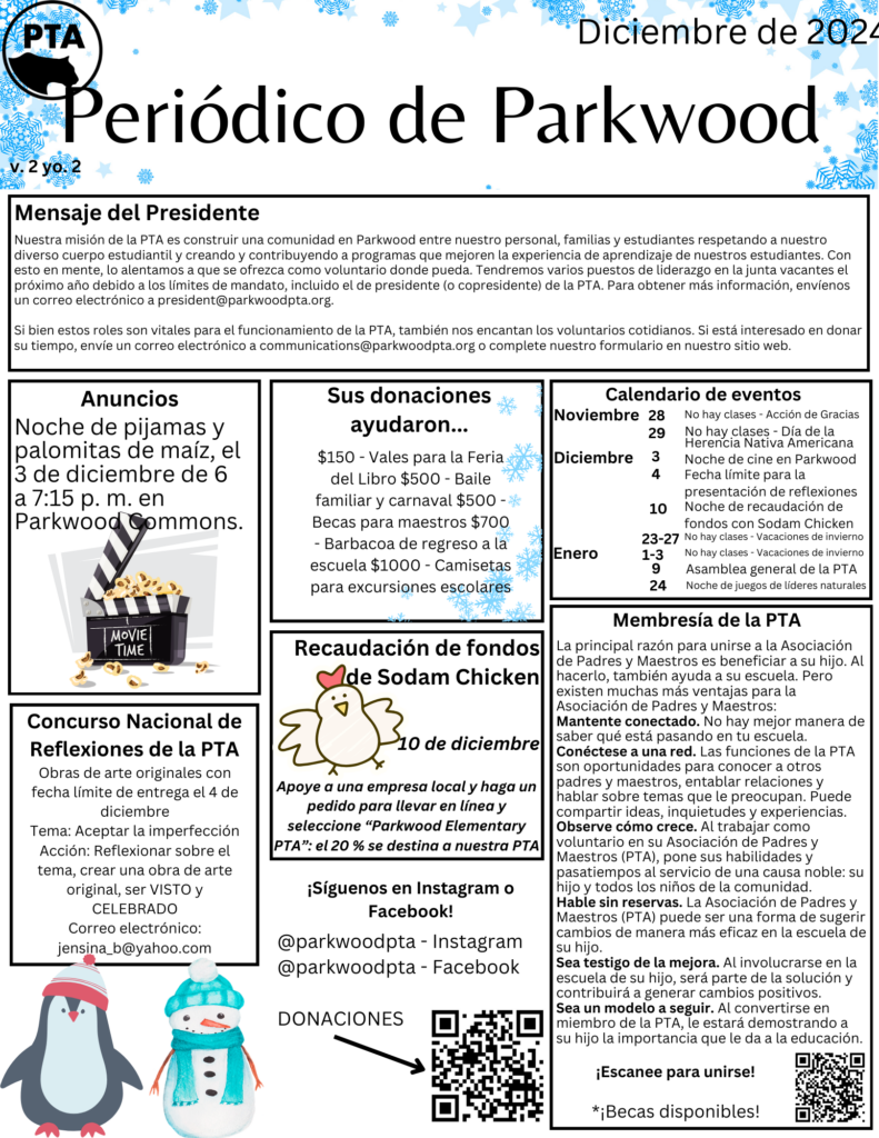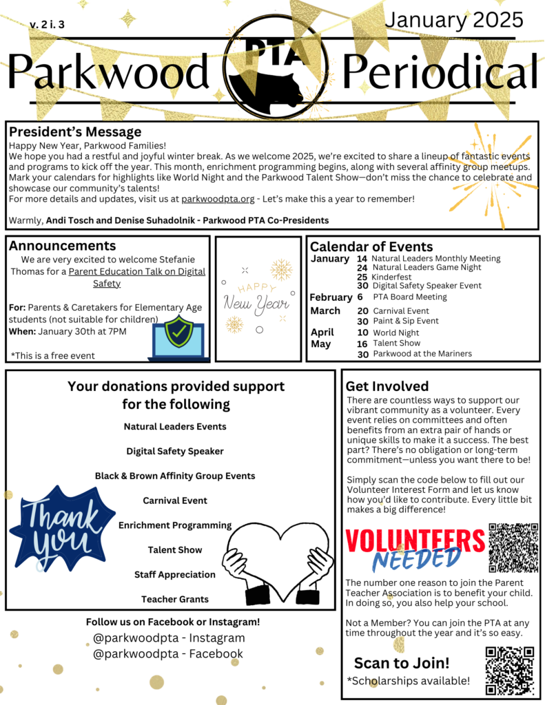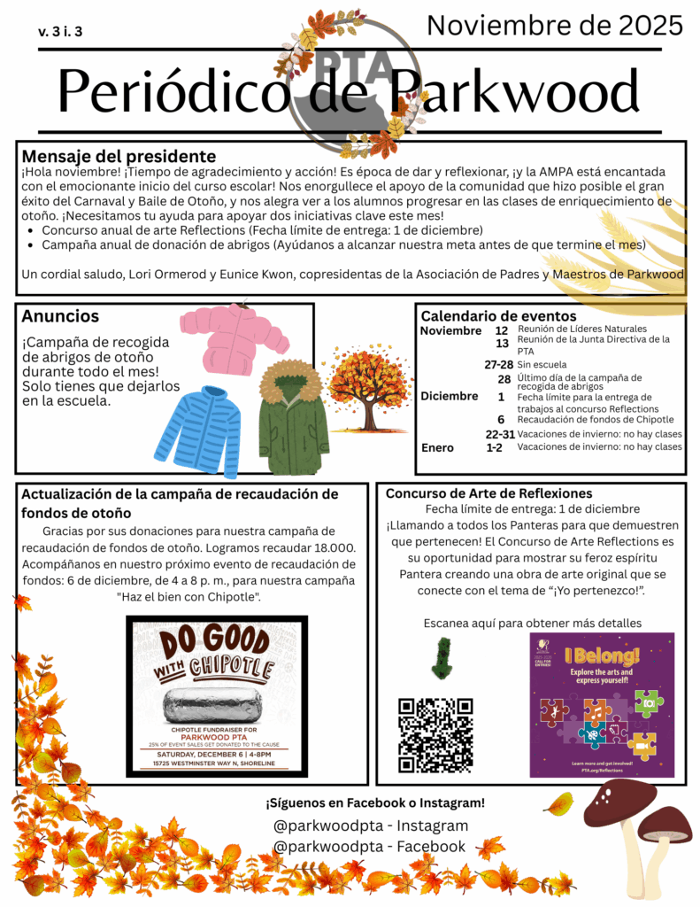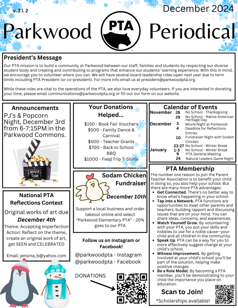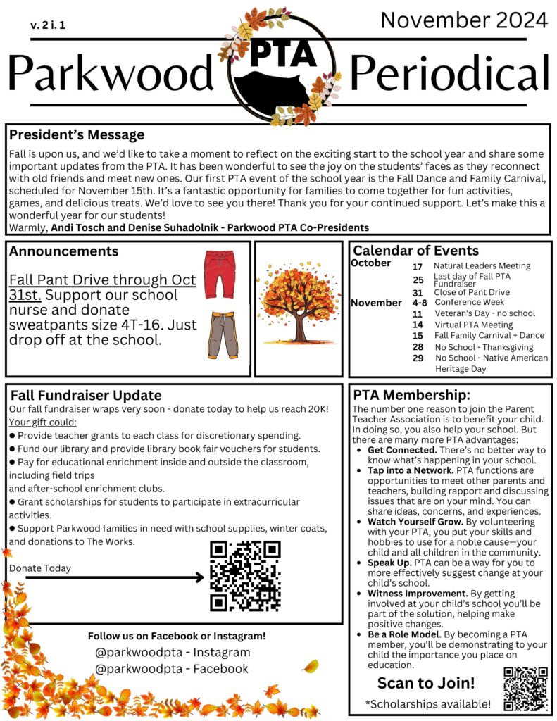 The Parkwood PTA newsletter is full of great information about our school. This publication is sent out monthly and will highlight current events and activities happening at Parkwood.