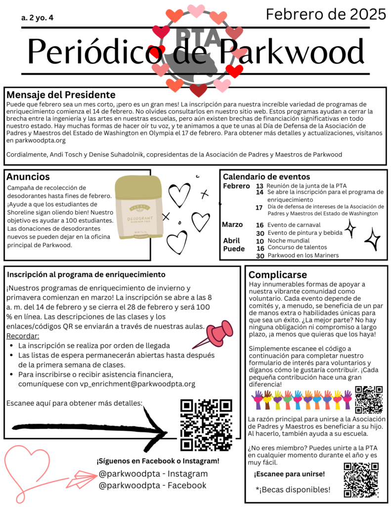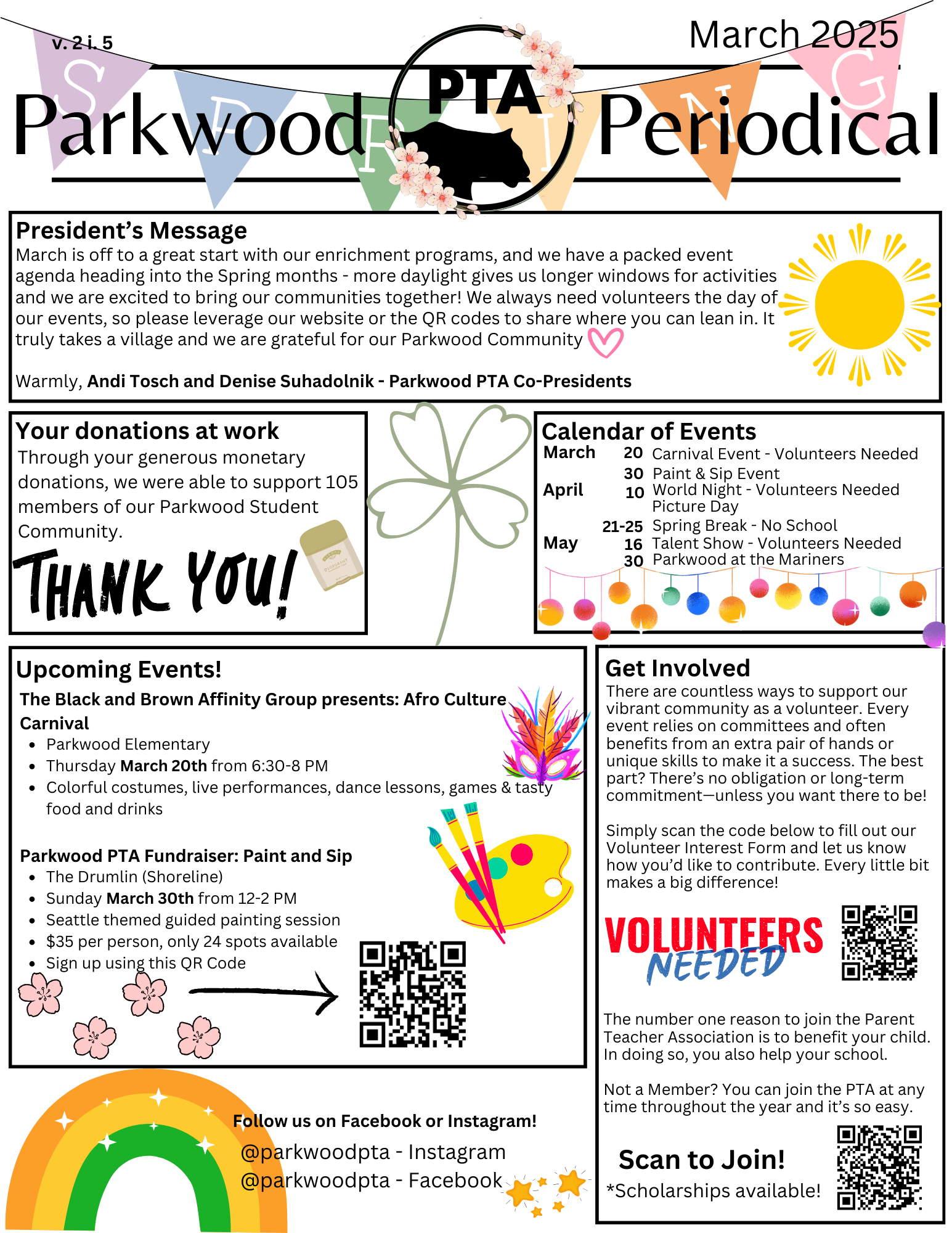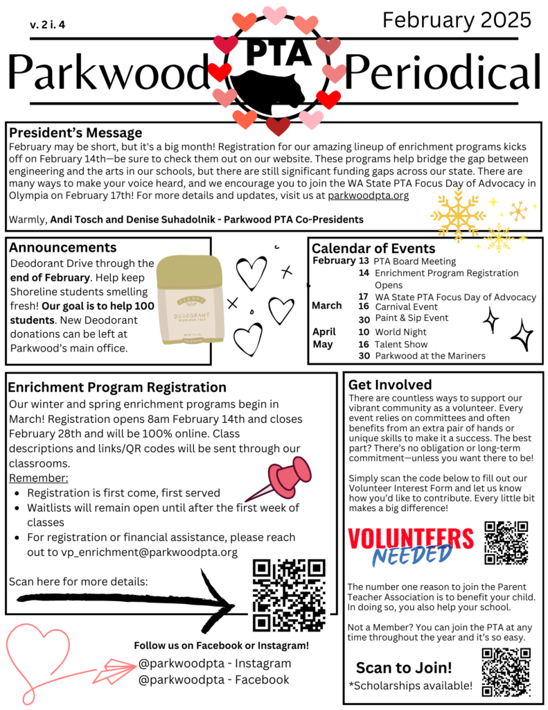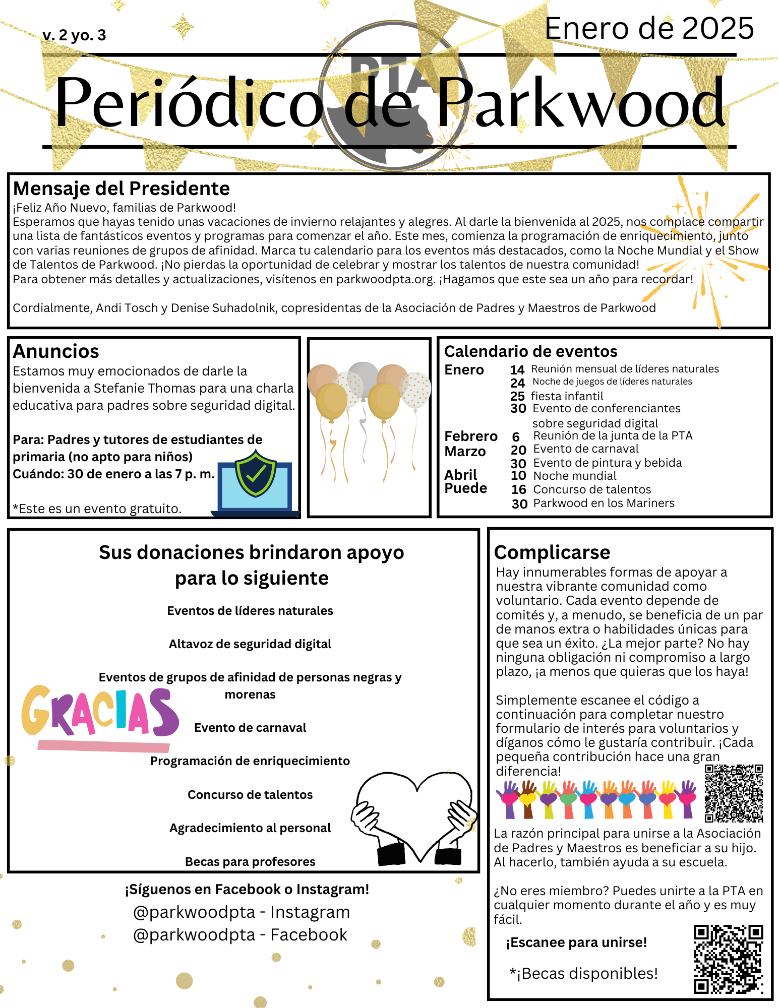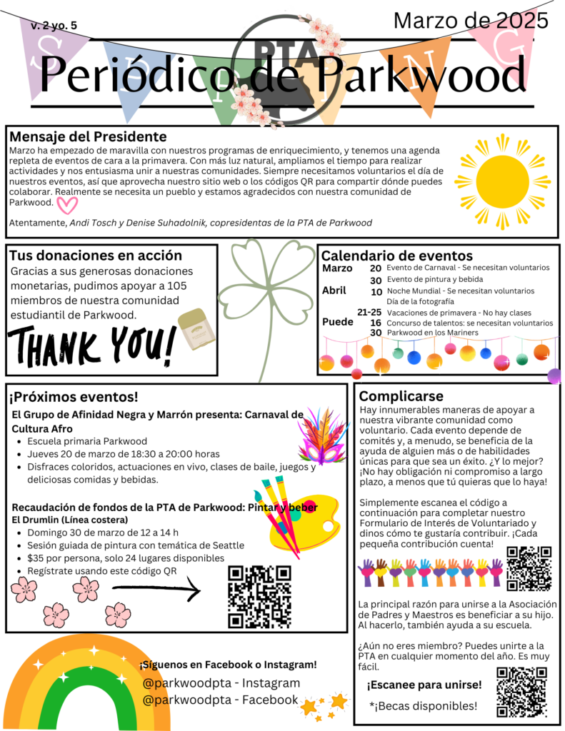 The Parkwood PTA newsletter is full of great information about our school. This publication is sent out monthly and will highlight current events and activities happening at Parkwood.
