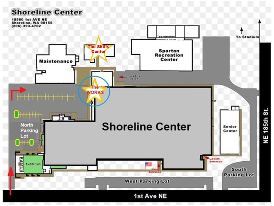 The Works is located on the north side of the Shoreline Center at 18560 1st Ave NE, Shoreline, WA 98155! Enter the north parking lot off of 1st Avenue NE (just south of the tennis courts). Once in the parking lot, drive straight until you have to turn right. Then as you continue straight ahead, you’ll see our blue door and the sign for The Works.